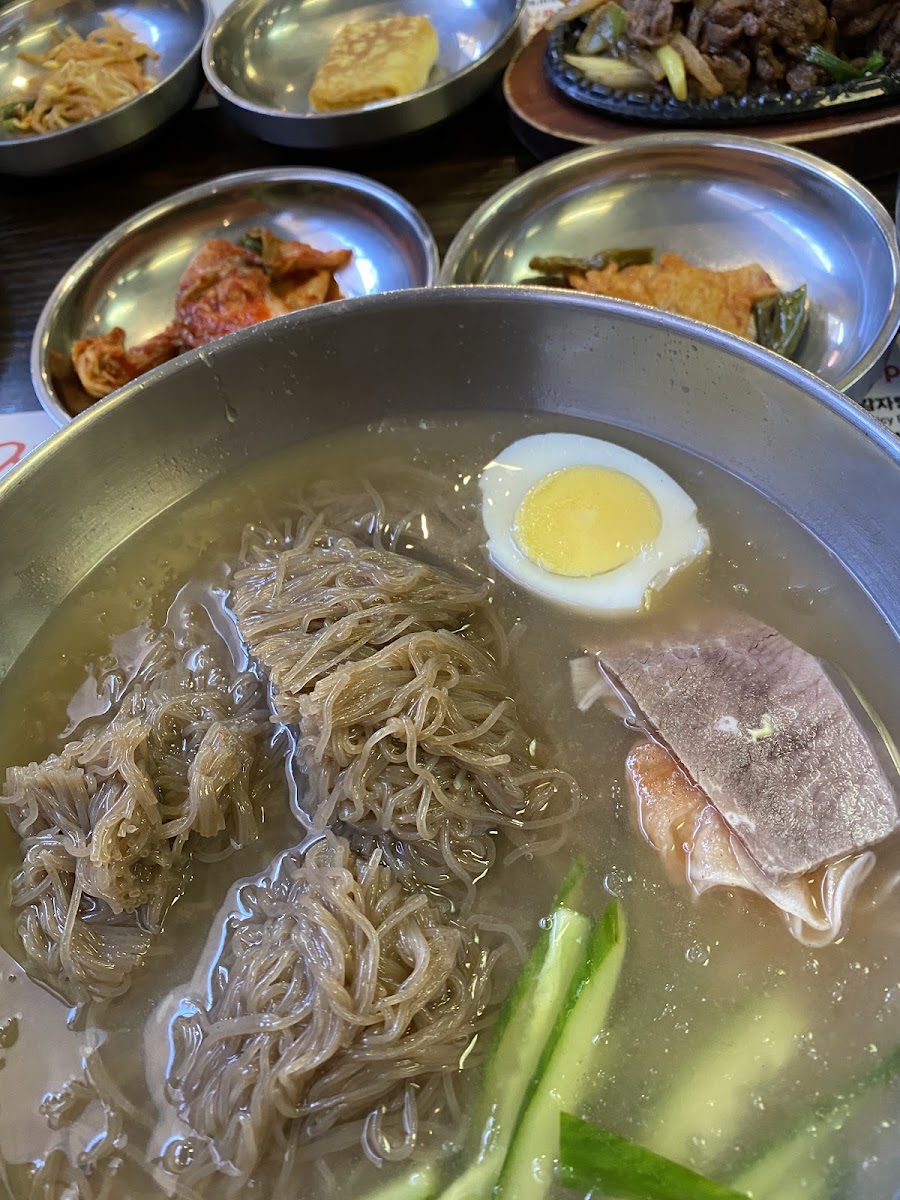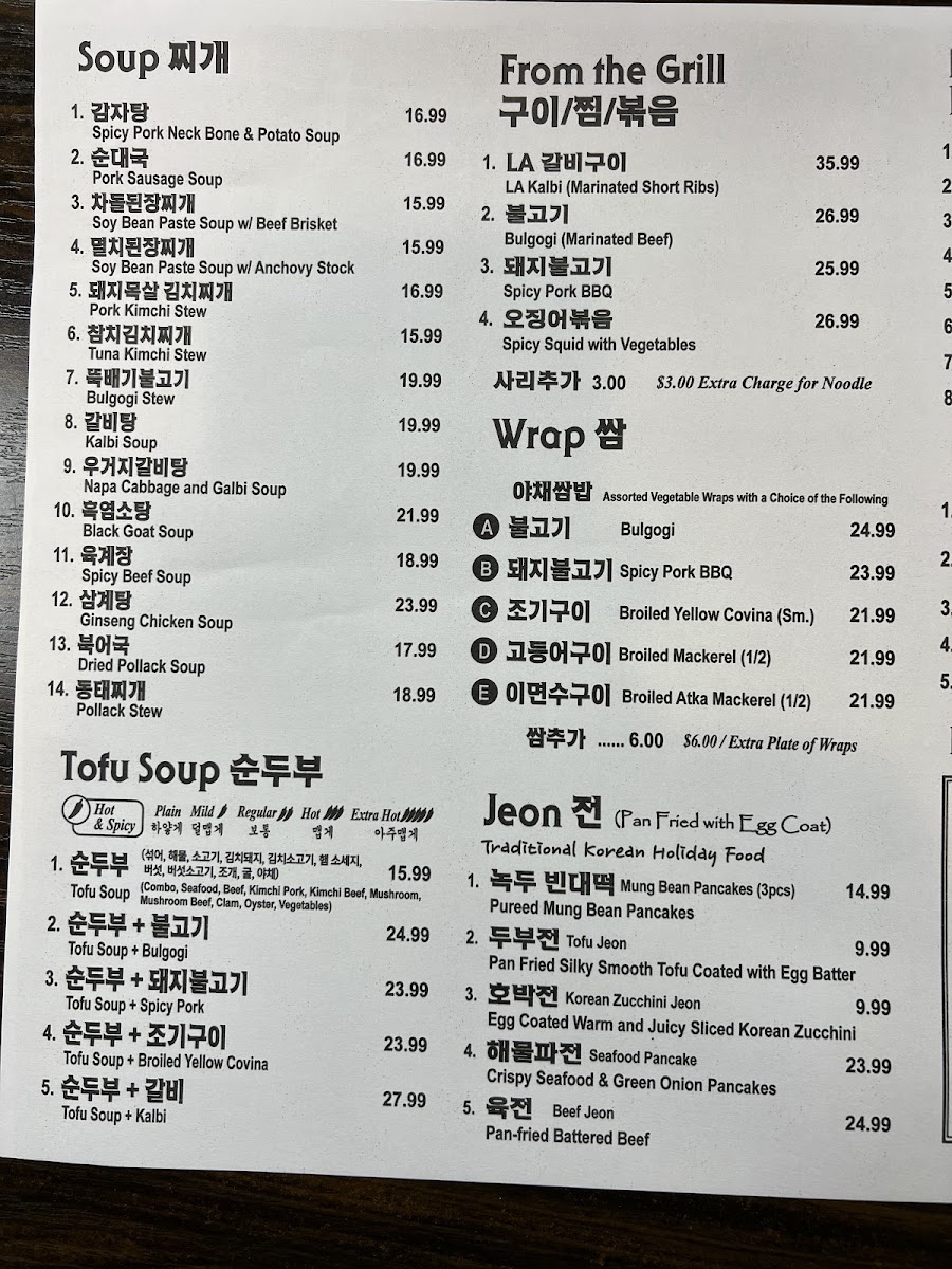 No visit is complete without indulging in their hand-pulled noodles. The Seafood Noodle Soup (해물칼국수) and Clam Noodle Soup (바지락 칼국수), both offerings at $19.35, are rich and flavorful, with tender noodles swimming in a broth that captures the essence of Korean cooking. Vegetarian options are also available, including the Perilla Seed Handpulled Noodles (들깨칼국수) for $22.85, providing a hearty choice for those looking for something different.